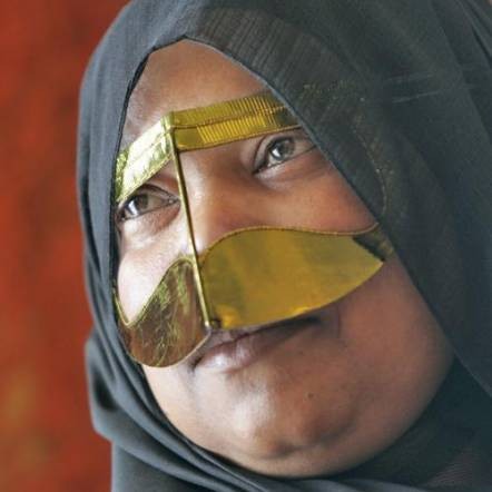 Aqui está uma imagem da burqa tradicional dos Emirados; nesta foto, a senhora que a usa é uma das poucas que ainda a produz manualmente.