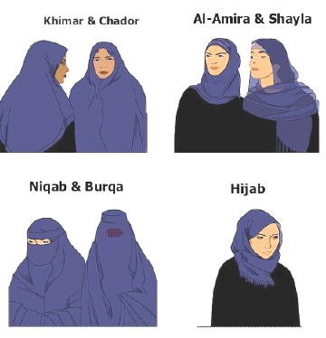 Nesta imagem estão representados também alguns dos outros tipos de lenços/véus utilizados: