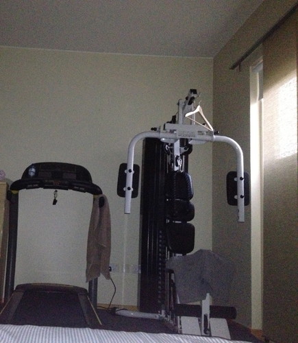 Não consigo decifrar algumas mensagens subliminares contidas nesta imagem. Reparem no pormenor do cabide pendurado no topo da máquina multi funções (ou lá como se chama o mamarracho). Que mensagem quererá passar aquele par de calções pendurado? E a toalha, na passadeira? Será uma tentativa de me mostrar a polivalência dos equipamentos? Olha, que jeitoso, faltava-nos um sítio para pendurar cabides! Ainda bem que pusemos as máquinas aqui no quarto, senão não nos safávamos de comprar um cabide daqueles de pé, horrorosos! E a toalha do exercício, tão bem que seca ali no estend... passadeira. O mau aspecto que aquela toalha ia dar num varão de casa de banho, que sorte termos aqui a passadeira tão ao jeito para nos poupar dessa visão!